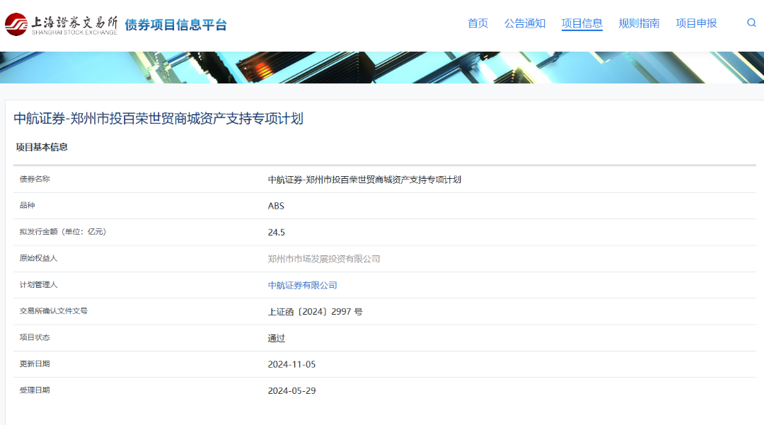 鄭州市投百榮世貿(mào)商城資產(chǎn)支持專項(xiàng)計劃獲上交所通過