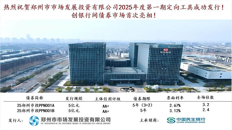 近日,鄭州市市場發(fā)展投資有限公司(以下簡稱“鄭州市投”,外部主體評級AA+)成功發(fā)行2025年度第一期定向債務融資工具,進一步優(yōu)化了公司融資結(jié)構(gòu)。本期債券由民生銀行擔任主承銷商,發(fā)行總規(guī)模10億元,創(chuàng)新采用“3+2年”(票面利率2.67%)與“5年”(票面利率3.12%)雙期限結(jié)構(gòu),創(chuàng)下近期同期限、同評級企業(yè)信用債首發(fā)利率較低水平,顯示出資本市場對鄭州國企發(fā)展前景的高度認可。