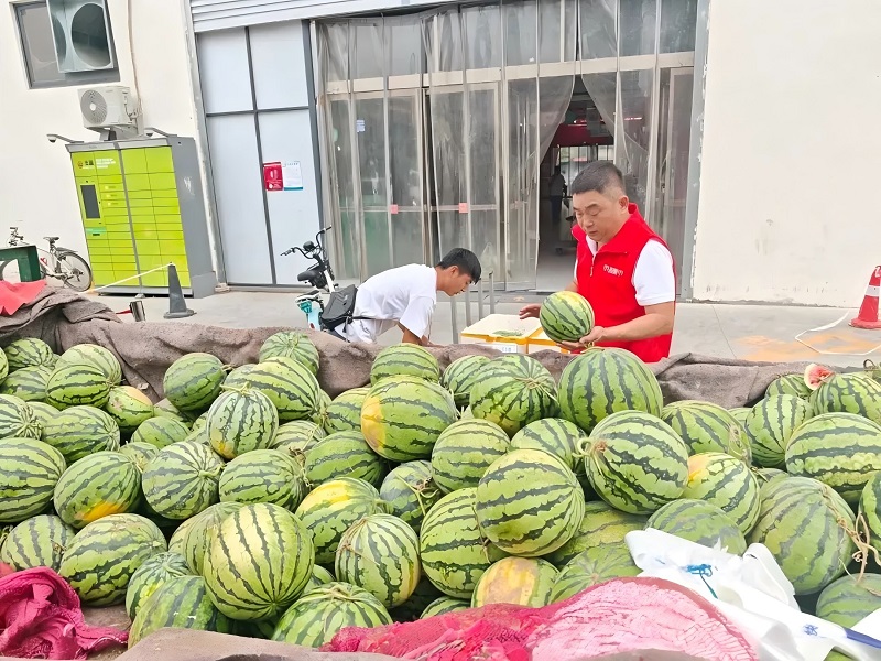了解到這一情況后,市投集市未來路市場(chǎng)管理人員立即主動(dòng)上前,與瓜農(nóng)深入溝通,并迅速協(xié)調(diào)安排,將整車2000余斤西瓜轉(zhuǎn)運(yùn)至市投集市未來路市場(chǎng)內(nèi)避雨銷售。市場(chǎng)不僅免費(fèi)提供惠農(nóng)攤位,還通過線上線下渠道幫助推廣,號(hào)召市民朋友們愛心助農(nóng)。