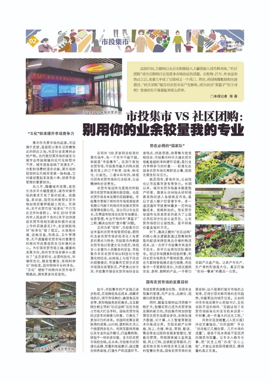 在2020年第48期專題中,我們通過鄭州市市場發(fā)展中心的推薦,采訪了鄭州農(nóng)貿(mào)市場里的標桿企業(yè),很多讀者對市投集市產(chǎn)生了濃厚的興趣,什么是國有農(nóng)貿(mào)市場?菜市場的公益性指的是啥?市投集市踐行標準化有什么突出特點?